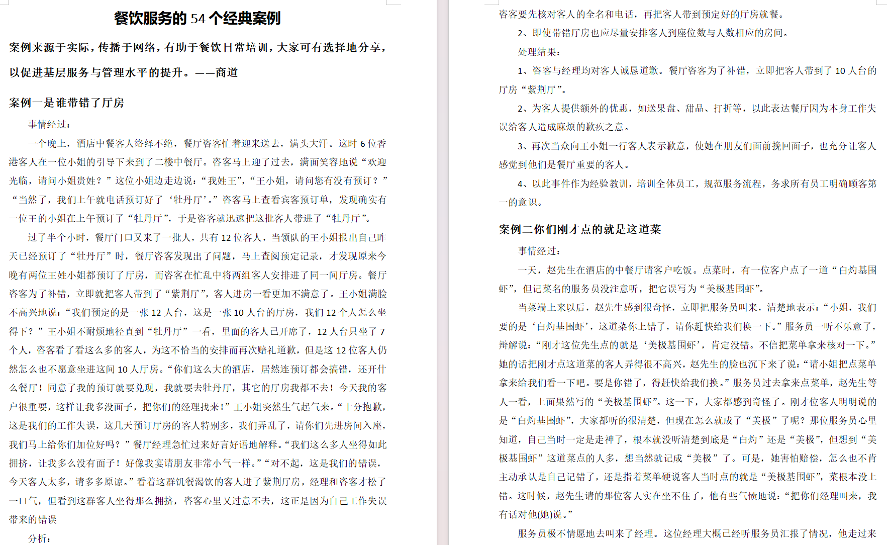 • 案例覆盖范围:包括预订错误、上菜失误、客户投诉处理、语言沟通问题、服务失误、食品安全、客户特殊需求等多个方面。
